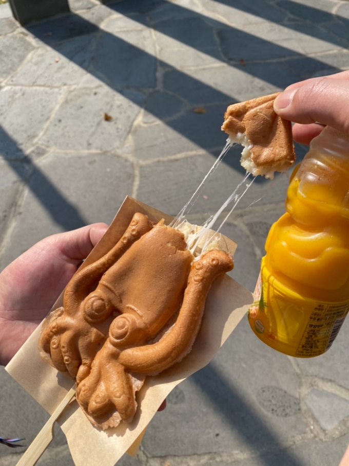 도대체 어떤 맛이길래 기다림을 감수하는 것일까. 그 맛이 궁금해 긴 줄 끝에 섰다. 약간의 기다림끝에 받은 '한치빵'의 맛은 붕어빵보다 훨씬 부드럽다. 다진 한치의 씹히는 식감도 미각을 자극했다. 메밀보리 반죽안에 모차렐라 치즈를 넣어서 그런지 씹을수록 고소함에 온 입안에 퍼졌다. '1개 3000원이나 해?' 싶었던 마음은 사라지고 '1개 3000원이나 할만하군' 싶었다.