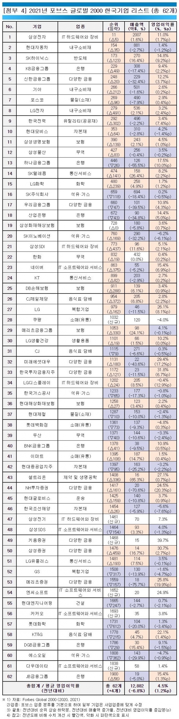 그러나 '글로벌 2000'에 속한 62개 한국 기업들의 영업이익은 전년보다 오히려 26.6% 상승했다. 이에 한국 기업들의 평균 영업이익률도 2021년 4.5%로, 전년보다 1.2%p 개선됐다. 글로벌 2000 기업수 상위 5개국(미국, 중국, 일본, 영국, 한국) 가운데 유일하게 한국만 영업이익률이 개선된 것으로 나타났다. '글로벌 2000'에 포함된 한국 기업은 2020년보다 4개 증가했다.
