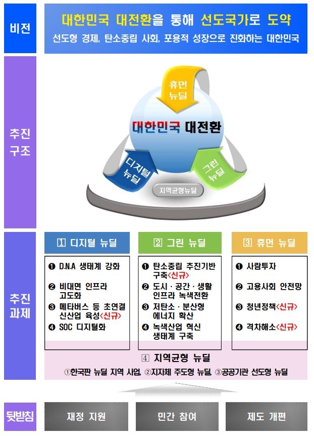 한국판 뉴딜은 코로나 위기에 대응하기 위한 대규모 일자리 창출 전략으로 '디지털 뉴딜'에 중점을 두고 출발했지만, 기후변화 대응과 저탄소 경제 전환의 속도를 높이기 위해 '그린 뉴딜'을 또 다른 축으로 세우며 본격적으로 한국판 뉴딜로 진화했다. 이후 추가적으로 고용안전망과 사회안전망 확충을 한국판 뉴딜의 토대로 삼으며, 완전한 모습을 갖췄다. 여기에 지역균형 뉴딜이 한국판 뉴딜의 정신으로 정립되며 지역 확산의 발판도 마련됐다.
