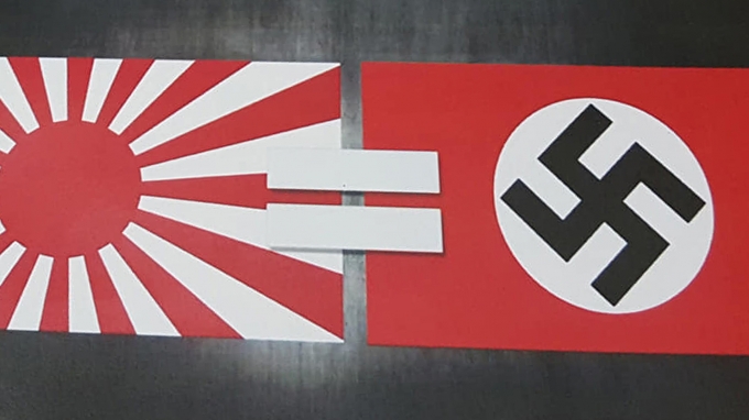 일본의 '침략' 역사가 전세계에 알려질까 두려워 '이순신 현수막' 철거를 주장한 일본 극우단체들. 하지만 그들은 전범의 상징인 '욱일기'를 흔들어대고 있으니 모순이 아닐 수 없다.