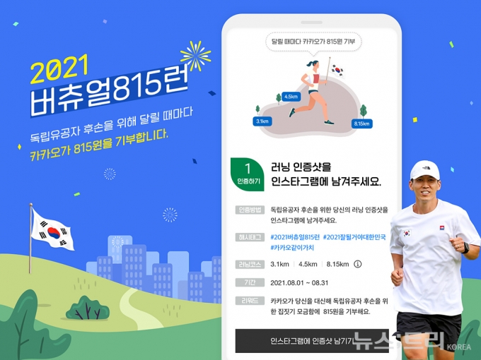 카카오(공동대표 여민수, 조수용)의 사회공헌 플랫폼 카카오같이가치는 광복 76주년을 맞아 이달 31일까지 '2021 버츄얼 815런' 인스타그램 인증 기부 캠페인을 진행한다고 2일 밝혔다.