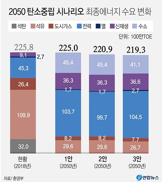 3가지 시나리오 모두 석탄·화력발전을 대폭 줄이고 재생에너지 비율을 늘리는데 방점을 두고 있다. 온실가스를 배출하는 화석연료(석탄·석유·도시가스)의 소비가 크게 줄어들고, 태양열과 지열, 수열, 바이오매스같은 신재생에너지 수요가 크게 늘어나게 된다.