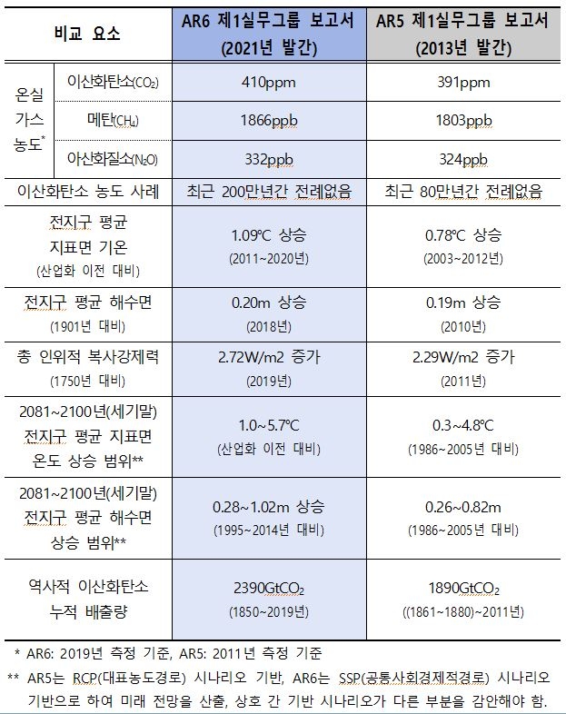 1850년 산업혁명 이후, 지난 40년간 지구 평균기온은 10년마다 최고점을 찍었다. 보고서에 따르면 2000년대들어 기온이 급격히 상승하면서 2011∼2020년 지구의 평균온도는 산업화 이전보다 1.09도 상승했다. 온실가스는 꾸준히 늘어 이산화탄소(CO2)는 410ppm, 메탄(CH4)은 1866ppb, 아산화질소(N2O)는 332ppb로 집계됐다. 특히 대기중 이산화탄소 농도는 200만년만에 가장 높은 수치를 기록했다.
