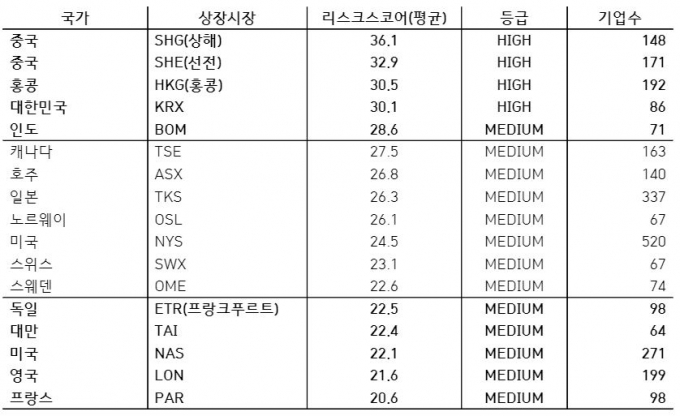 전세계 주요 증권거래소 가운데 상장기업들의 ESG 리스크가 가장 높은 시장은 상하이증권거래소(36.1), 선전(32.9), 홍콩(30.5), 한국거래소(30.1) 순이다. 이 시장들은 모두 '리스크 높음(HIGH)' 등급에 해당한다. 반면 리스크가 낮은 시장은 파리증권거래소(20.6), 런던(21.6), 나스닥(22.1), 대만(22.4), 프랑크푸르트(22.5) 순으로 나타났다.