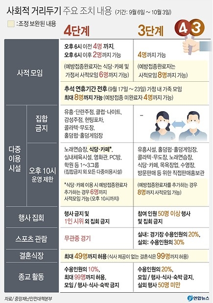 정부는 또 49명까지만 참석할 수 있었던 결혼식장 모임은 식사제공을 하지 않으면 3∼4단계에서도 최대 99명까지 참석할 수 있도록 방역수칙을 조정했다.