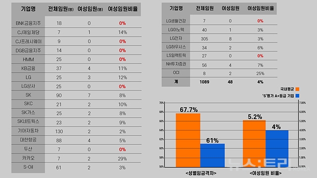 ESG(환경·사회·지배구조) 경영평가에서 상위등급을 받은 국내 기업들의 여성임원 비율은 4%에 그치고, 임금에서도 남녀격차가 심한 것으로 드러났다.