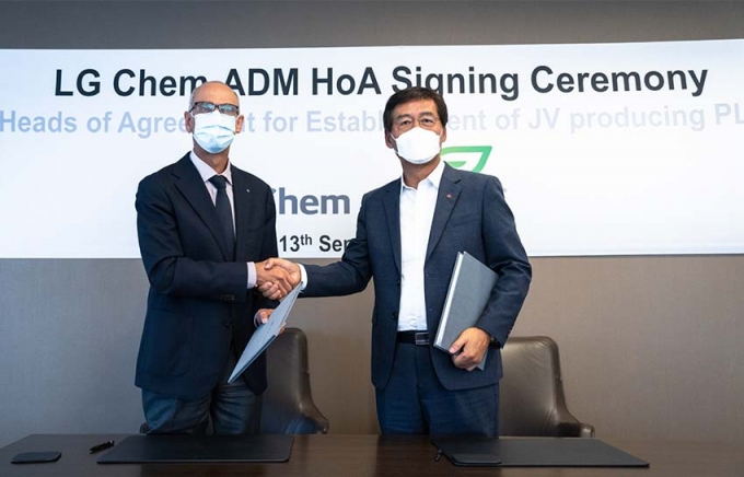 LG화학은 13일(현지시간) 미국 일리노이주 시카고에 위치한 ADM(Archer Daniels Midland) 본사에서 후안 루시아노 ADM 회장, 신학철 LG화학 부회장 등이 참석한 가운데 'LA(Lactic Acid) 및 PLA(Poly Lactic Acid) 합작법인 설립을 위한 주요조건합의서(HOA)'를 체결했다고 밝혔다.
