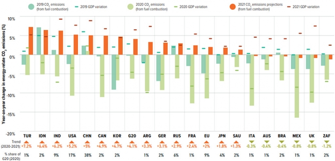 2020년 G20가 배출한 에너지 부문 온실가스는 6% 감소했다. 하지만 2021년 반등해 4.1% 증가하면서 G20가 전세계 온실가스 배출량에서 차지하는 비중은 75%에 달했다.