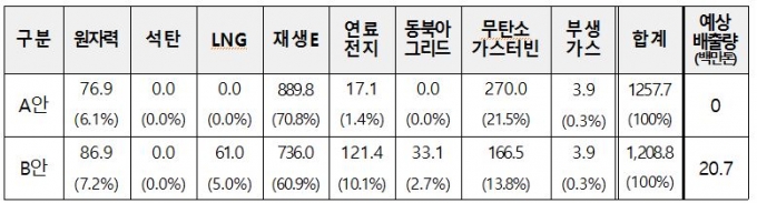 A안은 총 8040만톤(t)의 온실가스를, B안은 1억1730만t의 온실가스를 배출한 후 흡수 및 제거하게 된다. 태양광·풍력 등 재생에너지 비중은 2020년 6.6%에서 A안을 따를 경우 70.8%, B안을 따를 경우 60.9%로 대폭 높아진다. 또 현재 상용화되지 않은 무탄소 가스터빈이 A안에서는 21.5%, B안에서는 13.8%의 비중을 차지하게 된다.