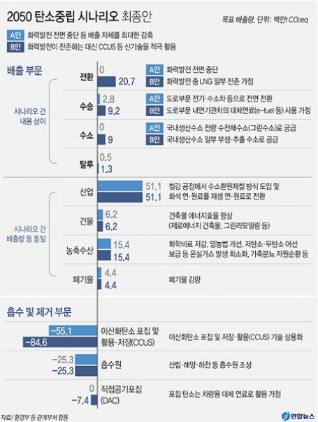 이 목표를 위해 탄중위는 2개의 시나리오를 정부에 제안했다. A안은 석탄발전과 액화천연가스(LNG)를 포함한 화력발전을 전면 중단하는 방안이고, B안은 석탄발전만 중단하고 LNG 일부를 남기는 대신 탄소포집 및 활용(CCUS) 등의 기술을 적극 활용하는 방안이다.