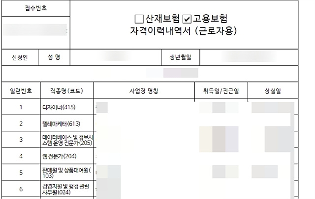A씨처럼 회사에서 실제로 담당했던 업무와 고용보험 '자격이력내역서'에 기재된 업무가 달라 재취업에 피해를 보는 사례들이 속출하고 있다. 자격이력내역서는 고용보험에 가입된 근로자의 직장과 근로기간, 직종 등을 표기하는 양식이다. 보통 정부지원을 받아 진행하는 직원들의 교육이나 재취업, 이직시 이력서의 내용에 허위사실이 없는지 확인하기 위해 자격이력내역서를 열람하는 경우가 많다.