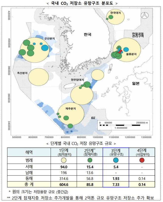 산업통상자원부와 해양수산부는 3일 서울 강남구 코엑스에서 관계부처 합동으로 개최한 '한국 이산화탄소 저장소 유망구조 및 저장용량 종합평가 심포지엄'에서 국내 해양에 7억3000만톤을 저장할 수 있고, 추가 시추와 탐사 등을 통해 최대 11억6000만톤의 탄소를 저장할 수 있다고 밝혔다.