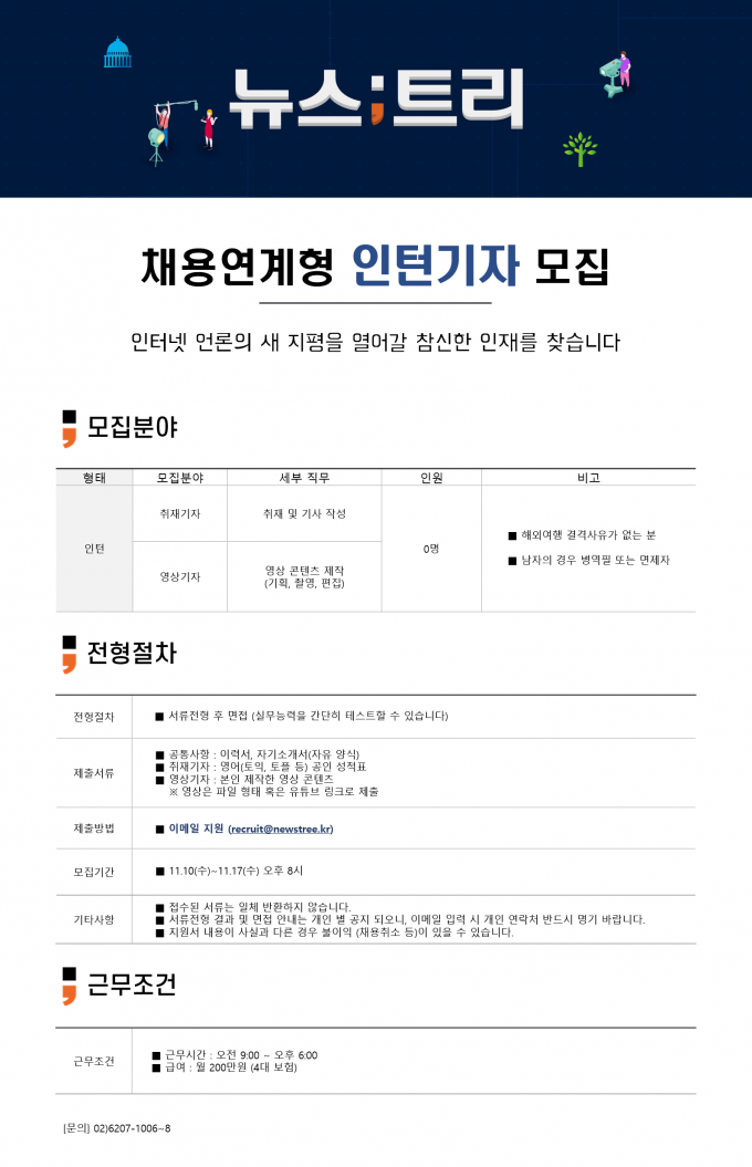 서류는 이메일(recruit@newstree.kr)로 제출하셔야 하며, 제출된 서류는 일체 반환하지 않습니다.