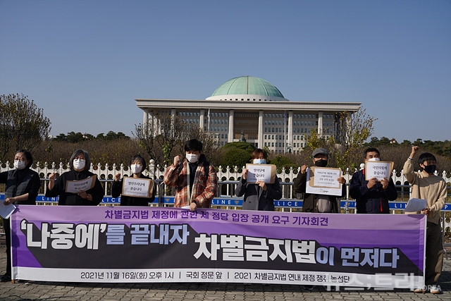 차별금지법제정연대(차제연)와 참여연대는 16일 서울 여의도 국회의사당 앞에서 가진 기자회견에서 "차별금지법에 대한 각 정당의 명확한 입장을 밝혀라"고 촉구했다. 차제연은 "평등한 사회로 나아가자는 시민들의 발걸음 앞에 국회는 홀로 달아나고 있다"고 국회의 미온적인 태도를 비판하며, 이날 더불어민주당과 국민의힘, 정의당 등 각 정당을 향해 '차별금지법에 대한 공개입장요구서'를 전달했다.