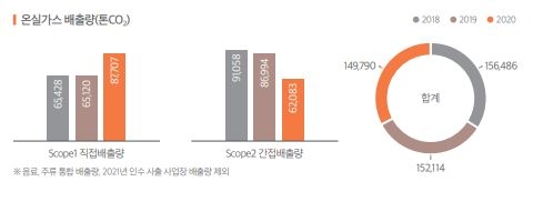 즉 SCOPE1 배출량은 2019년 6만5120톤CO₂에서 2020년 8만7707톤CO₂로, 1년 사이에 34.69%(2만2587톤CO₂) 증가했다. 반면 SCOPE2 배출량은 2019년 8만6994톤CO₂에서 2020년 6만2083톤CO₂로, 1년 사이에 28.64%(2만4911톤CO₂) 줄었다.