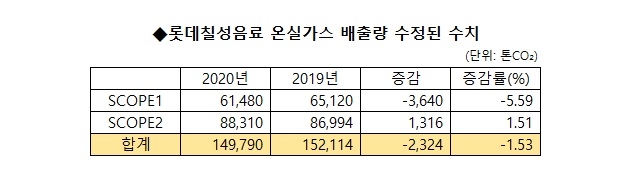 어떤 경위로 제품 생산과정에서 온실가스 배출량이 더 증가했는지 알아보기 위해 보고서를 발간한 당일인 19일 회사측에 문의한 결과 엉뚱한 대답이 돌아왔다. 롯데칠성음료측은 "온실가스 배출량을 집계하는 과정에서 수치를 실수했다"는 것이다. 그제서야 정확한 수치를 파악하기 시작한 회사측은 이후 "2020년 SCOPE1 배출량은 6만1480톤CO₂이고, SCOPE2 배출량은 8만8310톤CO₂"이라고 답했다.