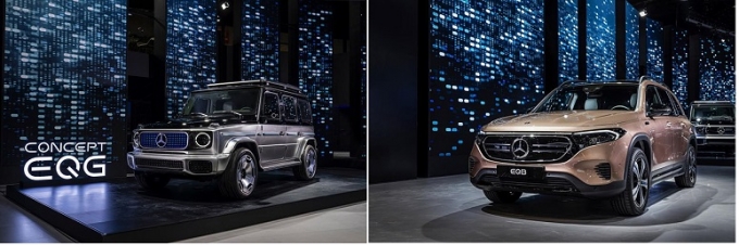 '컨셉 EQG'는 럭셔리 오프로더 모델인 G-클래스의 전동화 버전의 미래를 보여주는 콘셉트카다. 각 바퀴에 장착된 4개의 전기모터는 개별적으로 제어가 가능해 온·오프로드 상황에 최적화된 주행 성능을 제공한다. '더 뉴 EQB'는 EQA에 이어 메르세데스-EQ 브랜드가 선보이는 두번째 콤팩트 SUV 모델이다. 3열 시트를 추가해 7인승으로 확장할 수 있다. 2열 시트는 분할 폴딩이 가능해 최대 1710L의 적재 공간을 제공한다. 1회 충전시 유럽 WLTP 기준 419㎞를 주행할 수 있다.