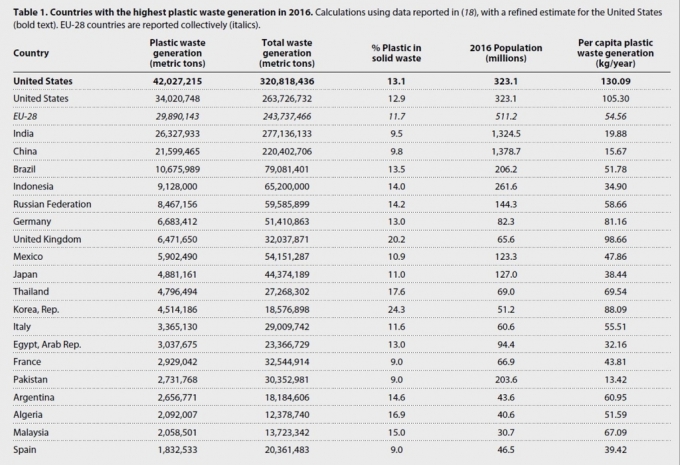 미국 국립과학공학의학원(NASEM)은 '세계 해양 플라스틱 쓰레기에 대한 미국의 역할 평가' 보고서에서 2016년 기준 각국의 국민 1인당 배출량을 산출했다. 보고서는 지난해 12월 미국에서 제정된 해양 보호법에 따라 추진되었다.