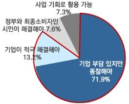 조사에 따르면 응답 기업의 71.9%는 플라스틱 폐기물 문제에 대해 '기업 부담이 있지만 동참해야 한다'고 답했고, 13.2%는 '기업이 적극 해결해야 한다'고 답했다. '기업이 아닌 정부와 최종소비자인 시민이 해결해야 한다'는 선택지를 고른 기업은 7.6%에 불과했다.