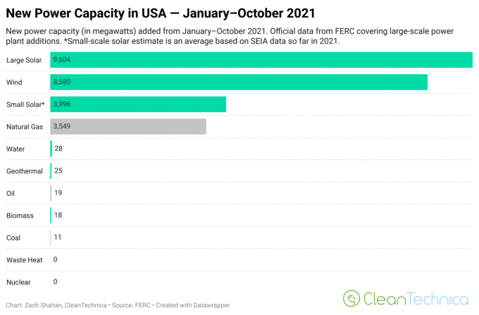 미국 클린테크니카(CleanTechnica)는 2021년 풍력 및 태양에너지가 미국 신재생에너지 생산량의 85.9%나 차지했다고 28일(현지시간) 밝혔다. 신재생에너지 부분별로 살펴보면, 올 1월~10월까지 태양광에너지는 미국 신재생에너지 전력의 37.2%(미국 연방에너지규제위원회(FERC) 기준)를 차지했고, 풍력은 33.2%, 소규모 태양에너지는 15.5%(미국 태양광산업협회(SEIA)의 2021년 3분기 데이터 기준), 천연가스는 13.7% 차지했다.