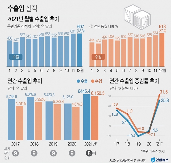 산업통상자원부가 새해 첫날 발표한 '2021년 12월 및 연간 수출입 동향'에 따르면 지난해 연간 수출액은 전년보다 25.8% 증가한 6445억4000만달러를 기록했다. 기존 최대치였던 2018년 6049억달러를 넘어 역대 최대치를 경신했다. 연간 수출은 3년만에 플러스로 전환했다. 수입은 31.5% 늘어난 6150억5000만달러로 집계됐다.