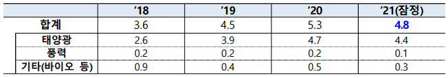 5일 산업통상자원부는 2021년 재생에너지 보급량이 4.8기가와트(GW)로 잠정 집계됐다고 밝혔다. 이 가운데 태양광 보급량은 4.4GW으로 전체의 91.6%를 차지했다.