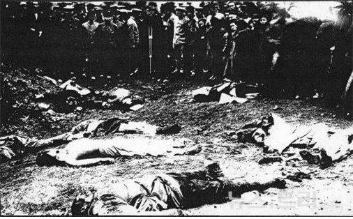 ▲일본군 19사단 보병 75연대의 사진첩에서 발견된 경신참변당시 학살 사진 이같은 사실이 널리 알려지면서, 상해거주 한인들은 1920년 11월 29일에 '간도참상 구제회'를 조직해 경신참변의 진상을 규명하고 피해 한인 구제에 진력했다. 우천 조완구가 대종교 대표로 참여했다. 미국의 '대한인국민회북미지방총회'도 경신참변을 미주한인들에게 전하며 구제활동을 적극 전개해 1200달러의 한인구제금을 간도로 보내기도 했다.