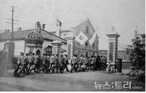 ▲일장기를 들고 부대로 들어가는 일본군 19사단 보병 75연대 병사들 '대한군정서'는 대종교 그 자체였다. 1913년 중광단, 1919년 자유공단・정의단, 1920년 대한군정서로 이어진 무장투쟁 단체는 대종교단의 지원으로 설립됐기 때문이다. 당시 일제의 기록에서도 이같은 내용을 찾을 수 있다. 1920년 10월 14일 기록된 일본 외교사료관 '鮮人ノ行動ニ關スル件'에 의하면 '군정서에 속하는 자 대부분은 대종교인'(不逞團關係雜件/ 朝鮮人ノ部/ 在西比利亞 第11卷)이라고 기술돼 있다.