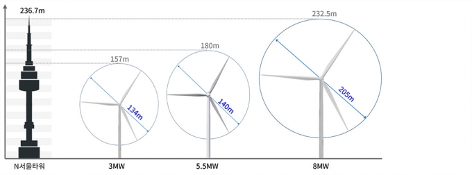 한국에너지기술평가원 국책과제로 2018년부터 산·학·연 협력을 통해 개발된 8MW 해상풍력발전기는 현재까지 우리나라에 설치된 풍력발전기 중 최대 규모다. 블레이드(날개) 길이 100m와 타워 높이(130m)를 포함해 전체 높이는 232.5m로 N서울타워(236.7m) 높이에 가깝다. 풍속 11m/s에서 8MW 출력이 가능하고, 평균풍속 6.5m/s에서도 이용률이 30% 이상인 고효율 제품이다.