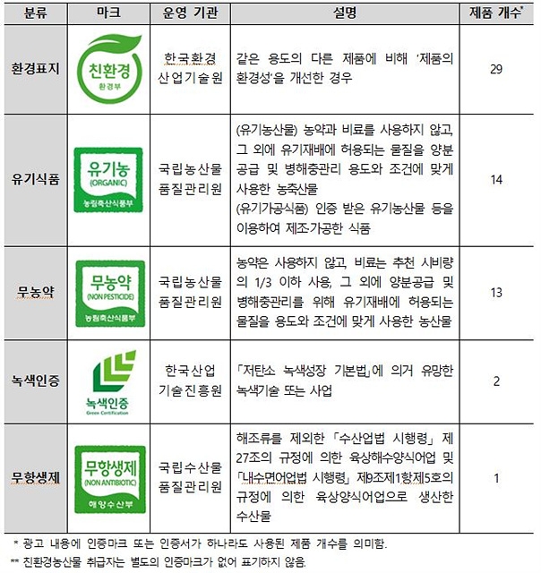 조사결과, 180개 제품 가운데 법정인증마크, 업계자율마크, 해외인증마크 가운데 한 가지 이상의 환경성 인증마크를 사용해 광고한 제품은 91개(50.6%)로 나타났다. 91개 제품 가운데 2개 이상 마크를 사용한 제품도 많았다. 법정인증마크를 사용한 제품은 60개(65.9%)였고, 해외인증마크는 36개(39.6%), 업계자율마크는 5개(5.5%)였다.