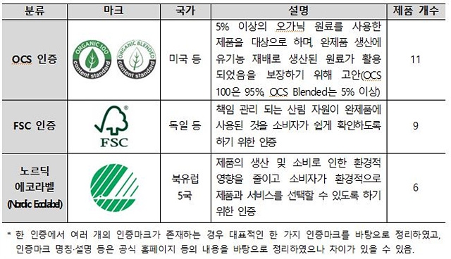 해외인증마크가 부착된 36개 제품에 사용된 해외인증마크의 종류는 20가지로 매우 다양했으며, OCS 인증 11개(30.6%), FSC 인증 9개(25.0%), 노르딕 에코라벨 6개(16.7%) 순으로 나타났다.