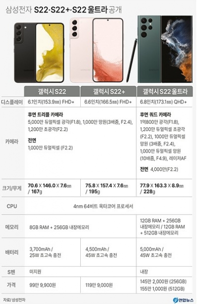 삼성전자는 10일 온라인으로 '삼성 갤럭시 언팩 2022'를 열고, 갤럭시 S22 시리즈를 공개했다. 갤럭시 S22 시리즈는 총 3종이다. 6.1형, 6.6형의 디스플레이를 탑재한 '갤럭시 S22'와 '갤럭시 S22+', 6.8형 디스플레이에 '갤럭시 노트'와 '갤럭시 S' 시리즈를 결합시킨 '갤럭시 S22 울트라' 등이다.