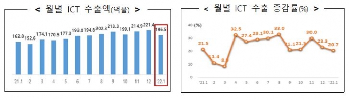 과학기술정보통신부(이하 과기정통부)는 지난달 ICT 수출이 전년 동기보다 20.7% 증가한 196억5000만달러로 잠정 집계됐다고 14일 밝혔다. ICT 무역 통계 집계한 이래 1월 수출 규모로는 최고치다.