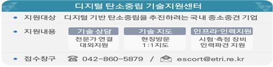 한국전자통신연구원(ETRI)에 설치되는 디지털 탄소중립 기술지원센터는 기업의 기술 애로사항을 상시 발굴하고, 전문가 파견 등을 통한 디지털 탄소중립 기술 지원과 시험·검증 장비 지원 등을 통해 우리 중소·중견 기업의 탄소중립 활동을 적극 지원할 예정이다. 일례로 네트워크(LoRa) 운영비용을 줄일 수 있는 안테나 기술, 중소형 공장 에너지 절감 기술, 건물 설비 에너지 자동화 알고리즘 개선 등이다. 기술 애로사항은 온·오프라인으로 모두 접수 가능하며, 필요시 현장 방문을 통해 기업의 숨겨진 애로사항을 청취할 예정이다.