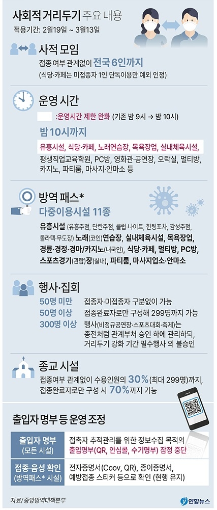 사적모임 최대 인원은 6명으로 유지된다. 백신 미접종자는 식당·카페를 혼자서 이용해야 하고, 식당·카페, 목욕탕, 노래방, 실내체육시설 등 다중이용시설 11종에 적용되는 방역패스도 그대로 유지된다.