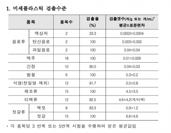 식약처는 102개 품목을 대상으로 2020년~2021년 미세플라스틱 오염도와 인체 노출량을 조사한 결과, 미세플라스틱 오염도와 식품 섭취량을 토대로 계산했을 때 식품을 통한 미세플라스틱 섭취량은 1인당 하루평균 16.2개로 나왔다고 했다. 각 품목에서 검출된 미세플라스틱의 양을 조사한 것이다. 식약처는 지금까지 알려진 미세플라스틱의 독성정보로 분석할 때, 이 정도의 섭취량은 건강상 영향을 우려할 수준은 아니라고 판단했다.