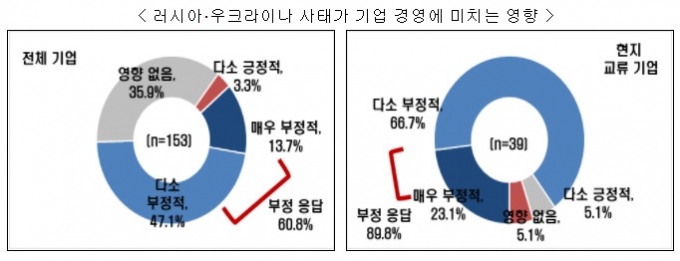 전국경제인연합회가 모노리서치에 의뢰해 매출액 1000대 제조 기업을 대상(153개사 응답)으로 '러시아‧우크라이나 사태의 기업 영향'을 조사한 결과, 응답기업 중 60.8%는 러시아‧우크라이나 사태가 기업 경영에 부정적 영향을 끼친다고 답했다. 특히 러시아 및 우크라이나와 투자‧교역 관계에 있는 기업 열 중 아홉(89.8%)은 이번 사태로 인해 기업 경영에 악영향을 받는다고 응답했다.