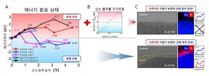 연구진은 또 표면 거칠기가 두 원자층 이상일 경우 구리 내부로 산소 침투가 쉽게 진행되지만, 완벽하게 평평한 면이거나 단원자층일 경우 상온에서는 산화가 일어나지 않는다는 사실도 규명했다. 게다가 초평탄 박막 표면에 존재하는 산소의 경우, 산소가 존재할 수 있는 자리의 50%가 차면 더이상 다른 산소가 접근하지 못하도록 밀어내 산화를 억제하는 '자기-조절 기능'이 있음을 밝혀냈다.