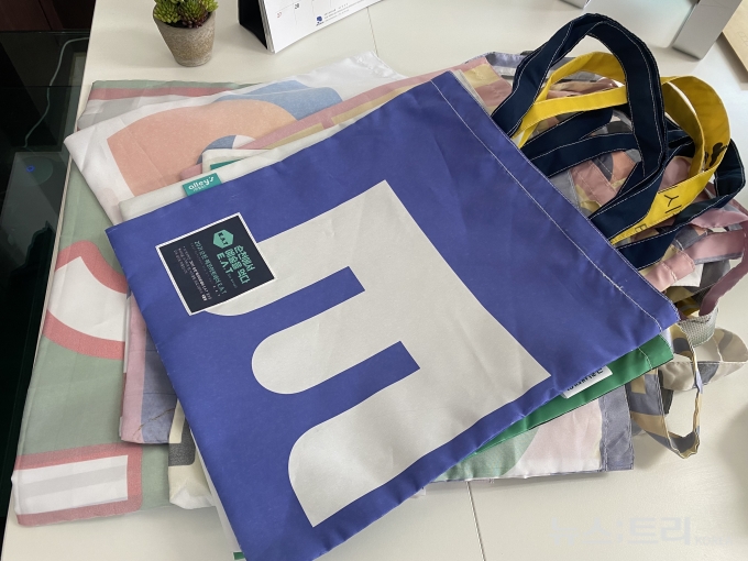 실제로 기자가 직접 찾아가 눈으로 확인한 '녹색발전소'의 창고는 알록달록한 현수막이 천장에 닿을만큼 쌓여있었다. 직원들의 손길도 분주했다. 현수막을 하나씩 꺼내 긴 책상에 펼친뒤 지지대 역할을 하는 나무막대기와 노끈을 분리하는 작업부터 했다. 창고 한켠에는 분리한 나무막대기가 가득했다. 나무막대기와 노끈이 제거된 현수막은 재단실로 옮겨 알맞은 크기로 자르고 재봉질했다. 가만히 들여다보니 현수막이 '에코백'으로 변신하고 있었다. 드르륵 드르륵 재봉질 몇번에 튼튼한 에코백이 하나씩 만들어지는 것이 신기했다. 이렇게 만들어진 에코백은 3000원에 판매한다.