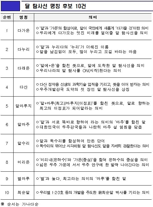 위 10개 명칭 중 우리나라의 '달 탐사선'에 가장 어울리는 이름은 무얼까.