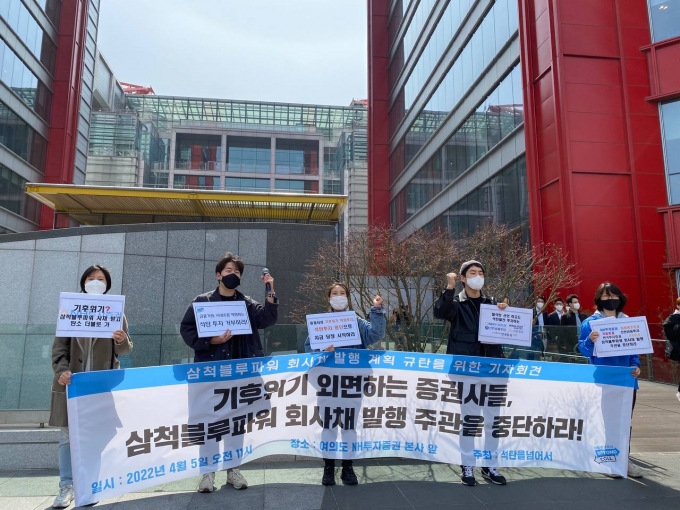 25개 환경·시민·청소년 단체들로 구성된 전국탈석탄네트워크 '석탄을 넘어서'는 5일 증권사들의 삼척석탄화력발전소(삼척블루파워) 회사채 주관을 규탄하고 자산운용사들에 회사채 인수 거부를 요구하기 위해 서울 여의도 NH투자증권 본사 앞에서 기자회견을 개최했다.