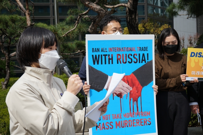 환경운동연합의 이지언 활동가는 "한국 금융기관은 전쟁과 기후위기의 연료인 화석연료 산업에 대한 투자를 당장 중단하고 철회해야 한다"며 "러시아 침공 전쟁의 자금처 역할을 하는 화석연료 산업에서 탈피하기 위해 세계 각국이 노력하고 있지만 한국은 이를 수수방관하고 있다"라고 말했다.
