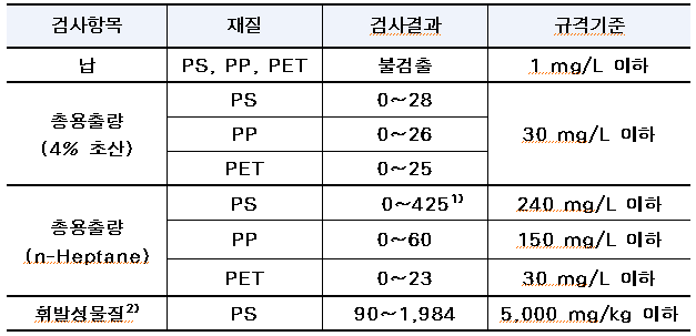 검사대상 일회용 플라스틱 용기 97건은 납과 총용출량, 휘발성물질(PS 대상)에서 모두 규격에 적합했다. 일반적인 밥이나 국, 튀김류 등의 용기로 사용해도 안전한 것으로 나타났다. 그러나 검사대상 가운데 3건의 폴리스티렌(PS) 재질의 용기는 지방성 식품을 대상으로 하는 총용출량 기준을 초과해 기름진 식품용기로 부적합한 것으로 나왔다.