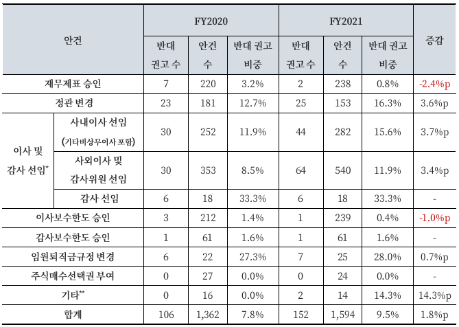 26일 ESG 평가 및 리서치 전문기관 서스틴베스트가 올 2~3월 정기 주주총회를 실시한 248개 상장사들의 주총 안건 1594개를 분석한 결과, 안건의 9.5%에 해당하는 152개의 안건에 대해 반대를 권고했다. 이는 지난해 안건 반대 비중인 7.8%에 비해 크게 증가한 것으로, 주주들의 목소리가 그만큼 커지고 있다는 방증이다.