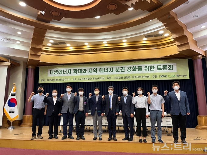더불어민주당 신영대 국회의원과 윤준병 의원 주최로 지난 2일 국회의원회관에서 열린 '재생에너지 확대와 지역 에너지 분권 강화를 위한 토론회' 참석자들은 현재 7%대에 머물고 있는 재생에너지 보급률을 높이기 위해서는 지역 에너지 분권을 위한 법적 장치가 마련돼야 한다고 입을 모았다.