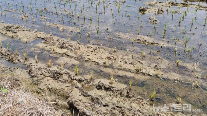 상황이 이렇다 보니 농가에서는 한번 사용한 농업용수인 '퇴수물'까지 다시 활용하기에 이르렀다. 집집마다 양수기로 퇴수물을 끌어다 쓰려다보니 이제 양수기마저 품귀현상을 겪고 있다는 것이다. 이 씨는 "엎친 데 덮친 격으로 모를 뜯어먹는 굴파리들이 기승을 부리고 있는데 모 상태가 좋지 않다보니 방제약도 함부로 뿌리지 못한다"고 했다.