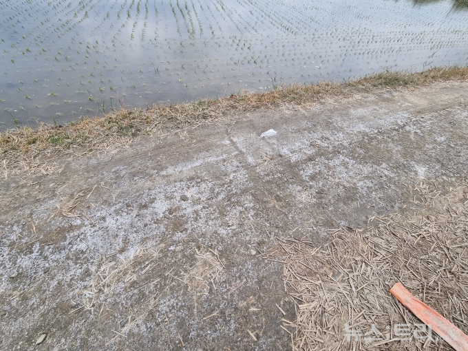 이 씨가 손으로 논두렁길을 훑자 손가락 사이로 하얗게 소금 결정이 올라왔다. 그는 "소금기 있는 물이라도 퍼서 써야 한다"면서 "그거라도 없으면 모가 아예 죽어버리니까"하며 한숨을 쉬었다.