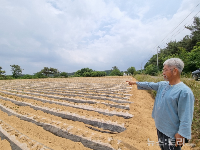 이 씨는 "가뭄이 계속 이어지면서 4~5일 전부터 땅 위로 소금기가 올라왔다"면서 "인근에 하천이 한 곳도 없다 보니 비가 안 오면 계속 호수 물을 퍼 쓸 수밖에 없는데 이제 소금물만 남은 것"이라고 답답함을 토로했다.