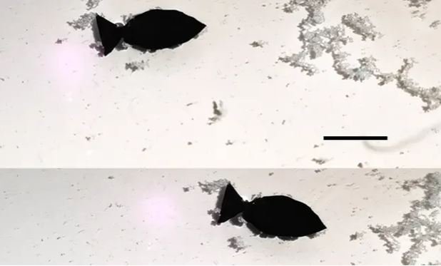 22일(현지시간) 중국 쓰촨대학교 연구진은 몸체에 미세플라스틱을 흡착해 수거하는 생체공학 '물고기 로봇'을 설계했다고 발표했다. 길이가 13mm에 불과한 이 물고기 로봇은 꼬리에 달린 레이저로 플랑크톤이 움직이는 속도와 유사한 1초당 약 30mm 속도로 헤엄칠 수 있다.