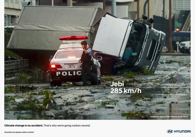 허리케인 카트리나, 태풍 제비 등 기후재앙으로 쑥대밭이 된 도시. 현대자동차 글로벌 브랜드 캠페인 'The Bigger Crash'의 한 장면이다. 이산화탄소 증가로 인한 기후변화의 심각성을 전달하고 미래 세대를 위한 친환경 움직임의 필요성을 강조한 이 캠페인은 올해 칸 국제광고제에서 은사자상(은상)을 수상했다.